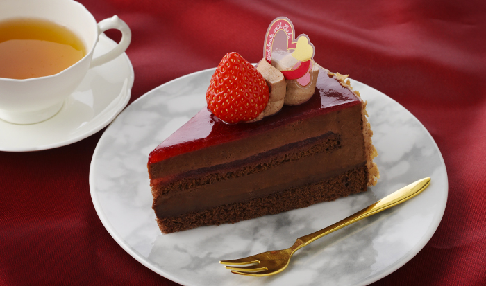 口どけなめらかなチョコムースと、濃厚な味わいのチョコレートガナッシュ、ほんのり甘ずっぱい苺ジャムを重ねて、上面はラズベリーグラサージュで艶めく鏡(ミロワール)のように仕上げました。苺の爽やかな甘ずっぱさとチョコのコクが、相性抜群の季節限定ケーキです。