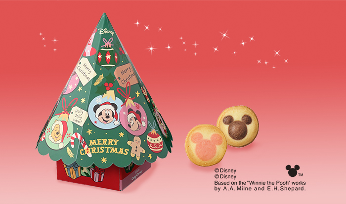 ツリー形ボックスに、サンタクロースに扮した「ミッキーマウス」や「ミニーマウス」たちをデザイン。