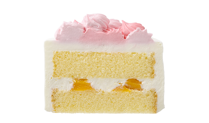 ふわふわのスポンジで黄桃入りのクリームをサンドし、苺クリームとお花の形のチョコレートで花束のように華やかに仕上げました。