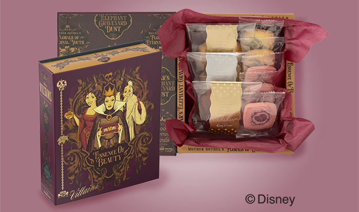 魔術書をイメージしたブック形ボックスに、『リトル・マーメイド』の「アースラ」、『ヘラクレス』の「ハデス」、『ライオン・キング』の「スカー」をプリントしたクッキーと、しっとりふんわり焼き上げたマドレーヌを詰め合わせました。