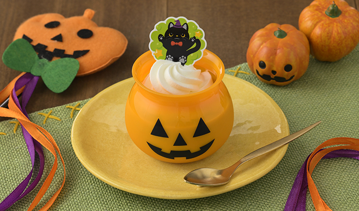 ジャック・オ・ランタンがモチーフの器に入った、ハロウィン限定プリンです。