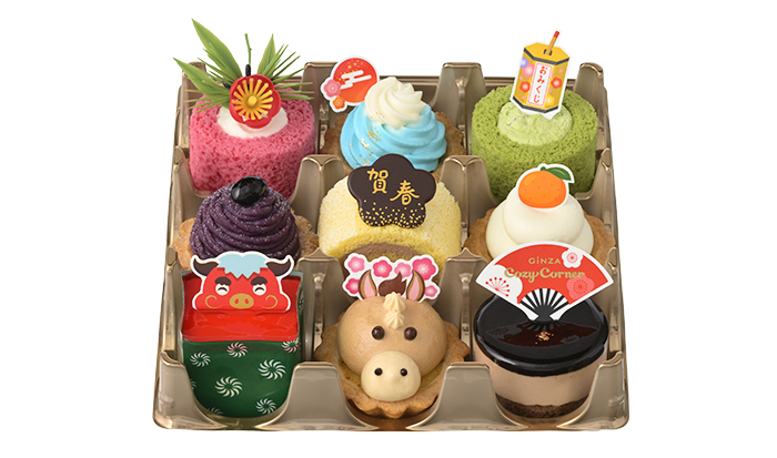 干支の”午(うま)”や初日の出をモチーフにしたタルト、おみくじ付きピックを飾ったロールケーキなど、9種のプチケーキをおせちのお重をイメージしたボックスに詰め合わせました。