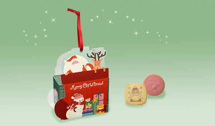 プレゼントを入れる靴下をイメージしたボックスに、2種のクッキーをアソートしました。正面はサンタさんとトナカイとスノーマン、裏面は2人のサンタさんのデザインが楽しめます。