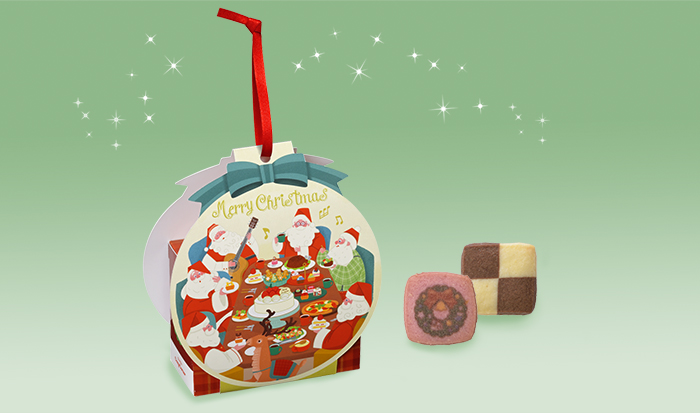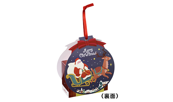 スノードームをイメージしたボックスに、2種のクッキーをアソートしました。正面はサンタさんたちがパーティーをしている様子が、裏面は子どもたちへプレゼントを届けに行くサンタさんとトナカイのデザインが楽しめます。