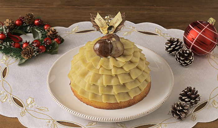 和栗入りアーモンド生地に口あたりなめらかな和栗ムースを重ね、濃厚な味わいの和栗あんを贅沢に絞りました。フリルのようなモンブラン絞りがパーティーに華を添えます。